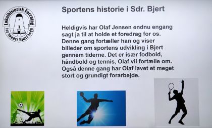 Ca. 90 personer var mødt op og fik en dejlig aften, hvor Olaf fortalte og viste billeder om sportens udvikling i Bjert gennem tiderne. Han koncentrerede sig specielt om fodbold, håndbold og tennis.